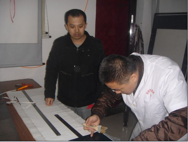 3、印痕划好后,两手拇指将边沿印痕向上折起,用指甲刮倒,然后垫隔糊在折印处刷上浆糊,每刷30厘米左右的浆糊应将边转上,防止浆糊湿透绫绢变软不易随印转直。