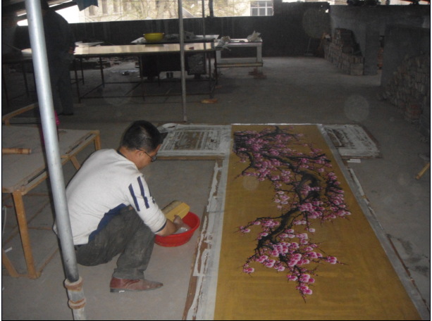 3、有的手卷画心较长,镶料长度不够长时,可用两段同样的镶料拼挖,挖的接头最好排列在菏泽书画装裱培训画心部位,并注意上下边的接头位置错开,不能在一条直线上,接缝处可采用碰缝软接的方法。