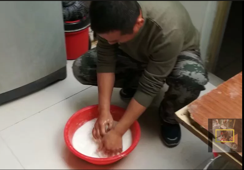 3、把面粉晒干,加入明矾粉少许,再和入秋天的陈天水,打成面粉团,放入锅中煮熟。