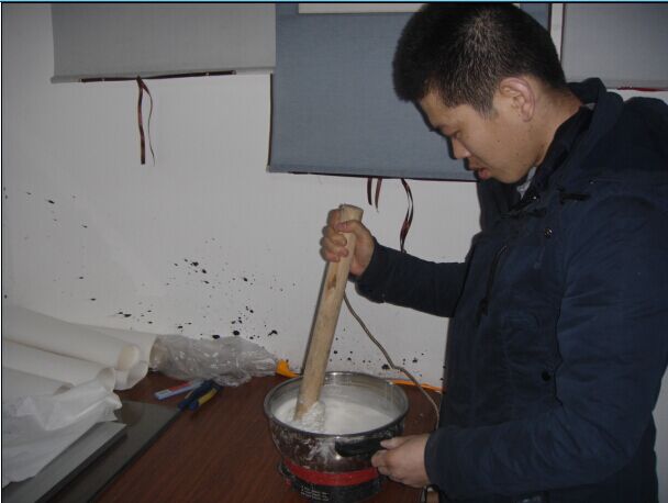 2016年3月4日,欢迎装裱培训专业新学员来培训中心学习,山东临沂——李轻鹏和哈尔滨——李雪业,报道。由全国有名的山东省菏泽市牡丹区“古裱派”创始人——卢老师,给新学员讲解书画装裱培训专业打浆糊技艺,并给字画装裱培训专业新学员讲解打浆糊之前的准备工作:沉淀的淀粉要搅匀、打浆糊的锅要干净、搅棒不要太粗也不要太细,并由卢老师给新学员做示范操作。