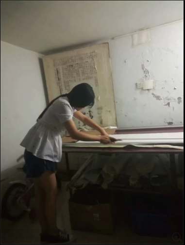 2、第一步首先将菏泽字画装裱培训作品画面上的蝇粪、黑点用刀尖轻轻刮掉。