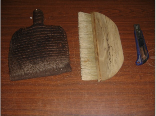 (3)排笔功:10余支羊毫笔并排扎接而成,用于刷浆糊,托画心、托绫子、覆背。右手握住排笔的中后部,拇指在前,其余四指在后,手虎口贴放到竹管上端。排笔运行时,只将笔尖的三分之二接触纸或绫、绢等。实际操作练习中逐渐体会、掌握。