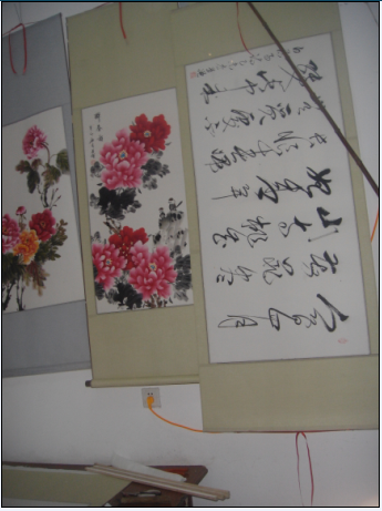 7、特大件的裱画培训作品作品在展挂时,因挂墙高度不够,画件就不能卷着天头张挂,只能是将地头卷着,下面垫着干净的纸(或布),用合适的重物挡着卷起的画卷。