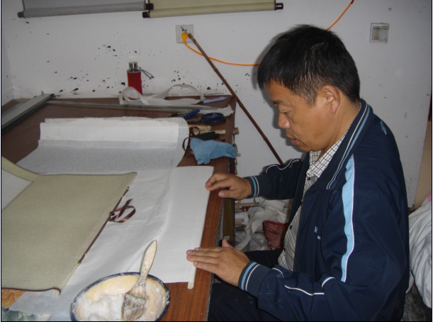 3、有的手卷画心较长,镶料长度不够长时,可用两段同样的镶料拼挖,挖的接头最好排列在菏泽书画装裱培训画心部位,并注意上下边的接头位置错开,不能在一条直线上,接缝处可采用碰缝软接的方法。