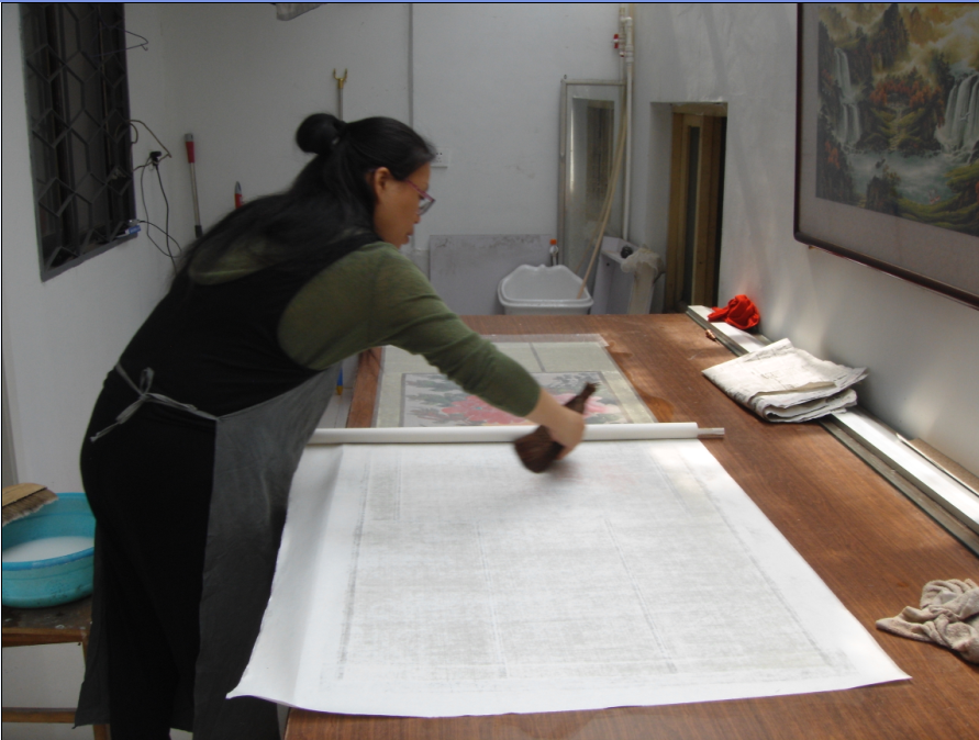 2、上好曹州装裱字画培训画心后,待纸性尚未伸涨,速将托件翻过来,置于垫有干纸的案上,火急排定,四周抹糊上壁。自托纸与画心合二为一后,最忌蹒跚平排,不然,纸性伸涨出来,上壁后画心略干,纸性回缩,就会从壁上掉下来。因此,—般的做法是将鹏翔培训装裱画心托好后,晾干,使托纸与画心粘牢,再潲水润平,上壁挣平为宜。