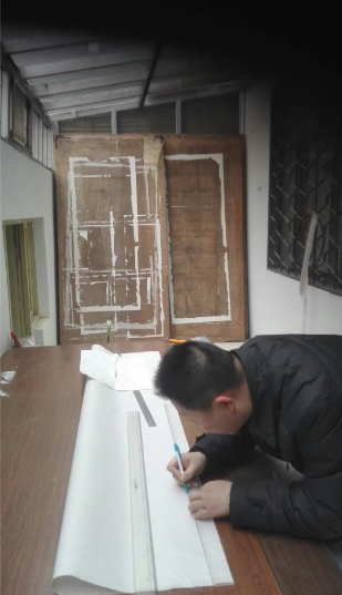 (3)撑料:用两手伸直手指把绫绢料的丝缕按经纬撑直伸平,先撑好一头作为标准,再撑好另一头。用毛巾以按揿法吸去部分水份,再推直经纬。这样吸一次水推整一次,使料子紧贴鹏翔书画装裱培训工作台面,绷紧绷直,撑好两头,中间自然平服,不平处稍加整理,做到丝直花正,即可上浆。