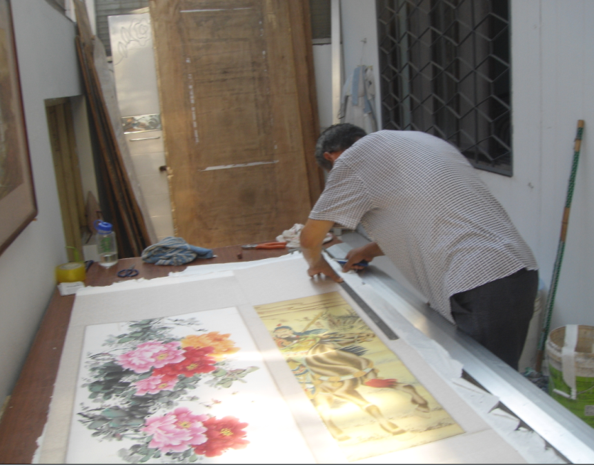 7、书画经覆背后,在挣子上时间的长短,是决定曹州裱画培训作品平展与否的一个基本因素。装裱行业有句行话说:“待要好,墙上老”,就强调了这个问题。周嘉胄在《装潢志》一书中有“停壁逾久逾佳”之说,并指出:“俾尽历阴晴燥润,以副得手应心之妙”。