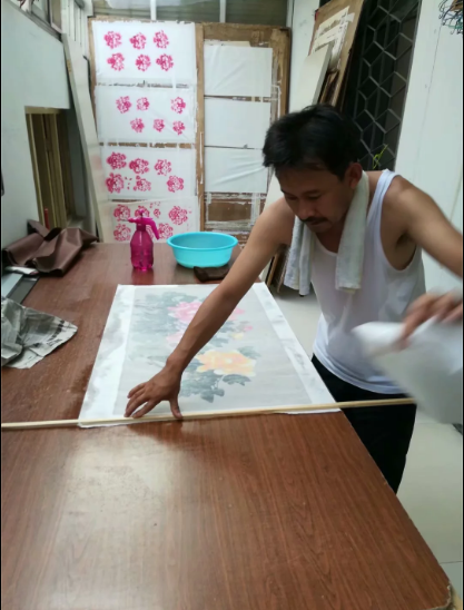 5、用糊与天气有关,如连日阴雨,浆宜从厚,天热风燥,浆宜从薄;菏泽学习装裱培训工作室,如系泥地或水泥地,贴画必然上燥下湿,干度不一,容易拔裂,宜在地面铺上几块木板以隔潮气;如遇返潮天气,在贴板着壁之下放上石灰包或干燥剂,以资收燥;如在楼上贴壁,画面宜避开日晒风吹,或作反贴,使之自然干燥,则糊性纯和,鹏翔裱画培训作品平挺。