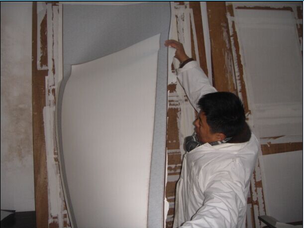 (2)字画装裱培训作品的幅面较宽较长者,采用以上方法下挣子难度较大,而且极易造成幅面打折。所以较大幅面的书画在下挣子时,可先将书画左右两边和下边全部起开,再由下向上将书画轻轻卷起,同时登上凳子,将天头部位揭下。